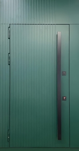 Стальная дверь с верхней вставкой, бугельной ручкой, широкими наличниками и зелеными панелями МДФ — это гармоничное сочетание классического дизайна и современных технологий. Панели из МДФ обеспечивают долговечность и стабильность внешнего вида на протяжении многих лет. Поддерживают эстетику пространства без перегрузки деталями. Дизайн подойдет тем, кто выбирает стиль и функциональность.